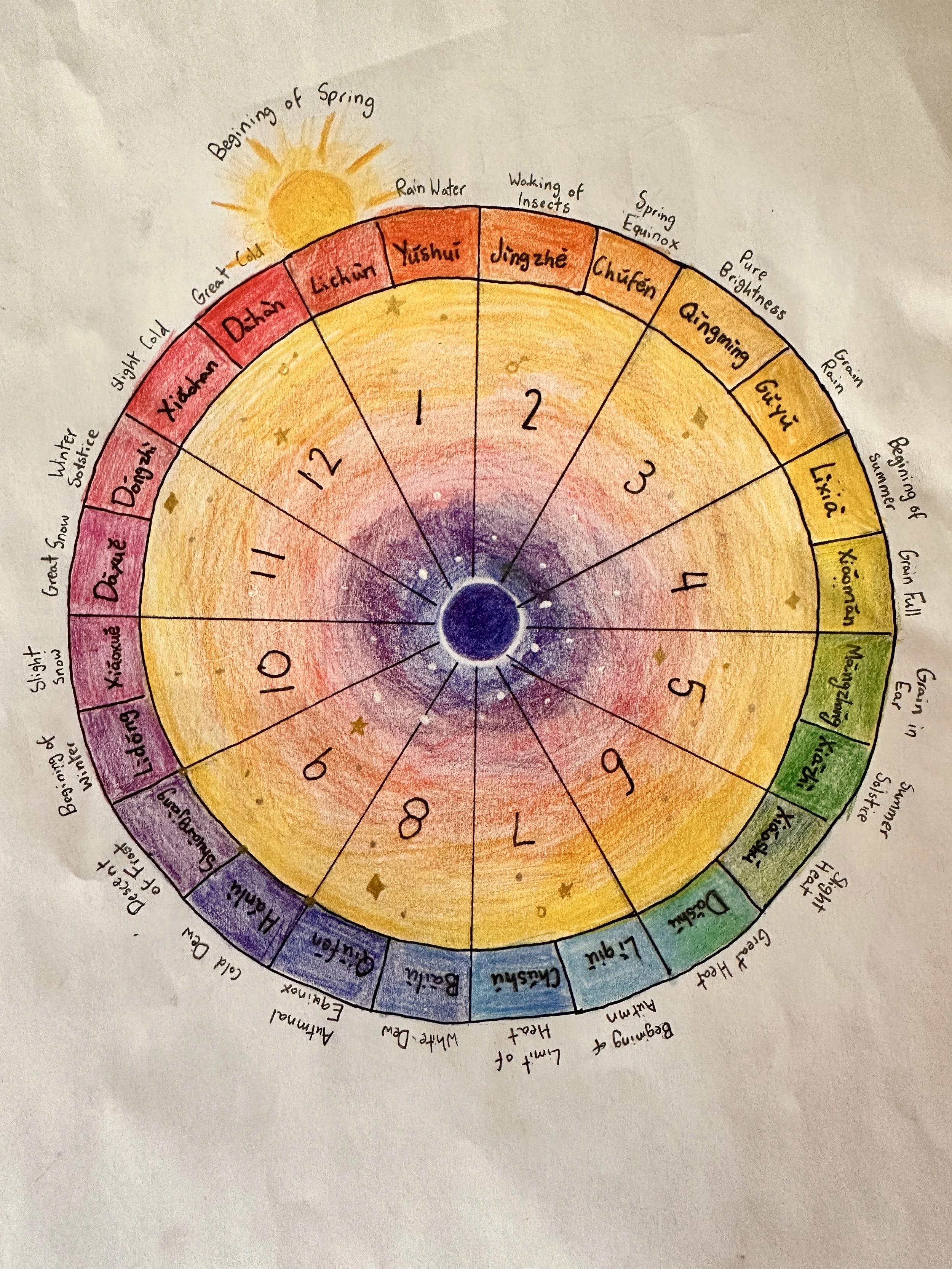 These questions led us down a rabbit trail to explore the use of Lunar-Solar calendars across different cultures. We were curious about how Hindus, Chinese, and other South Asians celebrate their traditional New Year at different times, even though they all follow the Lunar-Solar calendar. We discovered that the Chinese divided their year into 24 segments, with the Winter Solstice marking their 11th month, and how the Hindus divided their year into 12 months. DD drew a picture to illustrate the Chinese Luni-solar calendar.
